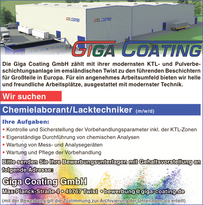 Du absolvierst deine Lehre in einer der modernsten Beschichtungsanlagen Deutschlands. Auf einer Produktionsfläche von rund 8.500 Quadratmetern werden bis zu neun Tonnen schwere Werkstücke beschichtet: Das ist einmalig! Mit einer betriebseigenen Lehrwerkstatt sowie individuellem Werksunterricht bieten wir dir die besten Voraussetzungen für eine erfolgreiche Ausbildung – denn die ist für uns erst der Beginn deiner beruflichen Laufbahn bei Giga Coating.